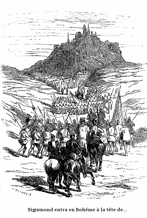 Sigismond répondit encore une fois qu'il était innocent de la mort de Jean Huss et de Jérôme de Prague, et que son intercession en faveur de la Bohème lui avait valu au concile des choses fort dures à digérer; que ce n'était pas la Bohème en elle-même qui avait été flétrie et condamnée, mais de mauvaises gens qui avaient pillé, brûlé, etc.; en d'autres termes, que la noblesse n'avait pas été compromise dans la proscription et pouvait se réhabiliter, grâce à lui; mais que ces mauvaises gens, c'est-à-dire le peuple et ses apôtres, devaient être châtiés et déshonorés à la face du monde. L'empereur prétendait n'avoir emporté la couronne, les titres, les joyaux et les reliques que pour les soustraire aux outrages; que d'ailleurs ces mêmes grands qui lui reprochaient cette action comme un vol, l'y avaient autorisé eux-mêmes, de leurs conseils et de leurs sceaux. Il comptait remettre à l'arbitrage des princes ses voisins et ses amis les désordres et les dommages dont on l'accusait en Bohème. Il concluait en promettant à la grandesse une augmentation de privilèges, en reprochant avec amertume au peuple la destruction de Wisrhad, des temples augustes et des belles églises de Prague, et en le menaçant de la colère de ses amis, c'est-à-dire de l'invasion étrangère, s'il ne respectait l'église de Saint-Weit et la forteresse de Saint-Wenceslas.