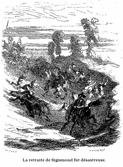 L'Empereur se retira en grande hâte en Hongrie. Le Florentin Pippo, aventurier intrépide qui le suivait, se noya sous la glace avec quinze cents de ses mercenaires, au passage d'une rivière