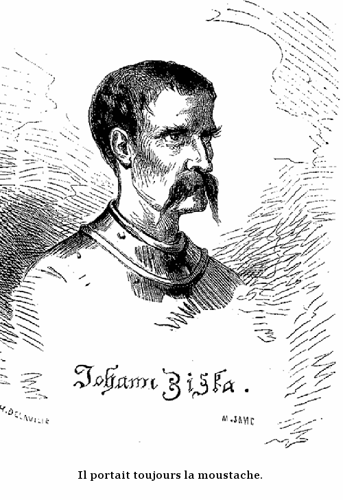 «Ci-gît Ziska, vaillant en guerre, la gloire de sa patrie, l'honneur de Mars. Il a précipité dans le Styx, avec sa foudre vengeresse, les moines, cette peste criminelle.—Il reviendra encore pour punir les bonnets carrés.»