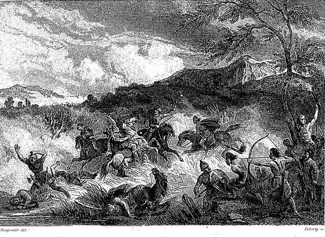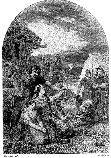 Notes D, E, F: Le roi Clotaire marchait comme un nouveau David allant combattre son fils Absalon, il s'écriait:--Seigneur, regarde-moi du haut du ciel et juge ma cause, car je suis indignement outragé par mon fils; vois et juge-nous avec équité et que ton jugement soit celui que tu prononças entre Absalon et son père David.--On combattit des deux côtés avec acharnement, Chram prit la fuite, il avait sur mer un vaisseau tout préparé; mais tandis qu'il voulait mettre en sûreté sa femme et ses filles, il fut surpris, saisi et enchaîné. Le roi Clotaire ordonna qu'il fût brûlé avec sa femme et ses filles; on les enferma dans la cabane d'un pauvre, et Chram, étendu sur un banc, fut étranglé avec un mouchoir; ensuite on mit le feu à la cabane, et ainsi sa femme et ses filles périrent avec lui. (Grégoire de Tours, Histoire des Franks, liv. IV, chap. XX.)