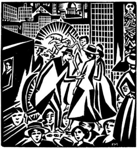 Bei der nächsten Station kam wilde Bewegung ins Gedränge. Schreiende Leute stürzten in den schon überfüllten Wagen. Peter verspürte den Anprall und tragenden Druck der Menschenwelle. Über dem Tunnel, oben über der großen Stadt, ein dumpfes Krachen. Der Zug fuhr weiter. In diesem Augenblicke rannte in wahnsinniger Angst ein Mensch die Treppe hinunter, indem er die Hände vors Gesicht hielt und — jetzt kollerte er ganz hinunter. Man sah gerade noch, wie ihm Blut zwischen den Fingern floß . . . Dann kam wieder der finstre Tunnel. Im Waggon Schreckensrufe: die Flieger sind da! . . . In der gemeinsamen Gefahr, darin diese gepferchten Leiber zu einem Körper verschmolzen, hatte Peters Hand die Hand ergriffen, die er dicht neben der seinen fühlte. Und wie er die Augen hob, da war es Sie.