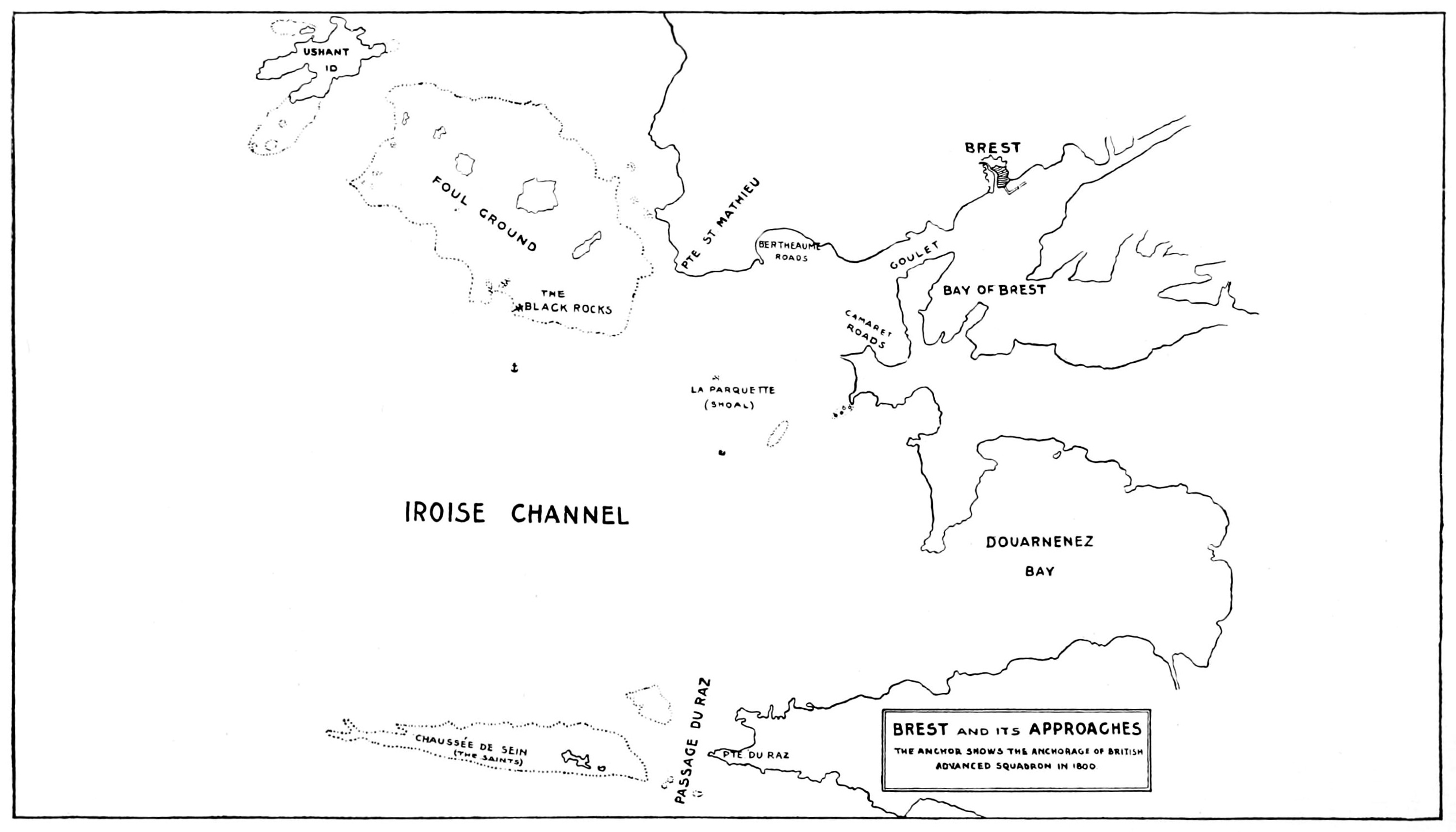 [308] There is between Ushant and the reefs a narrow passage, practicable for ships-of-the-line, which was surveyed under Lord St. Vincent; but it could only be used with pilots, and was rather a convenience than an important feature.