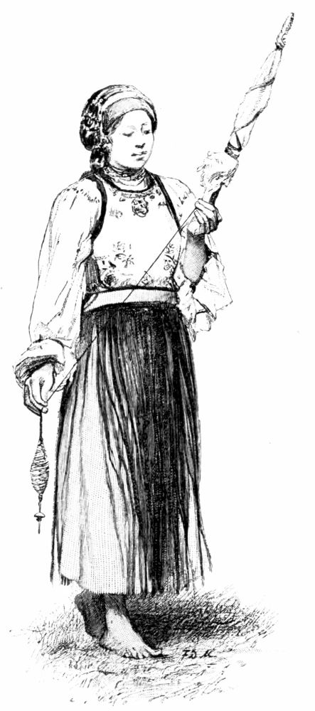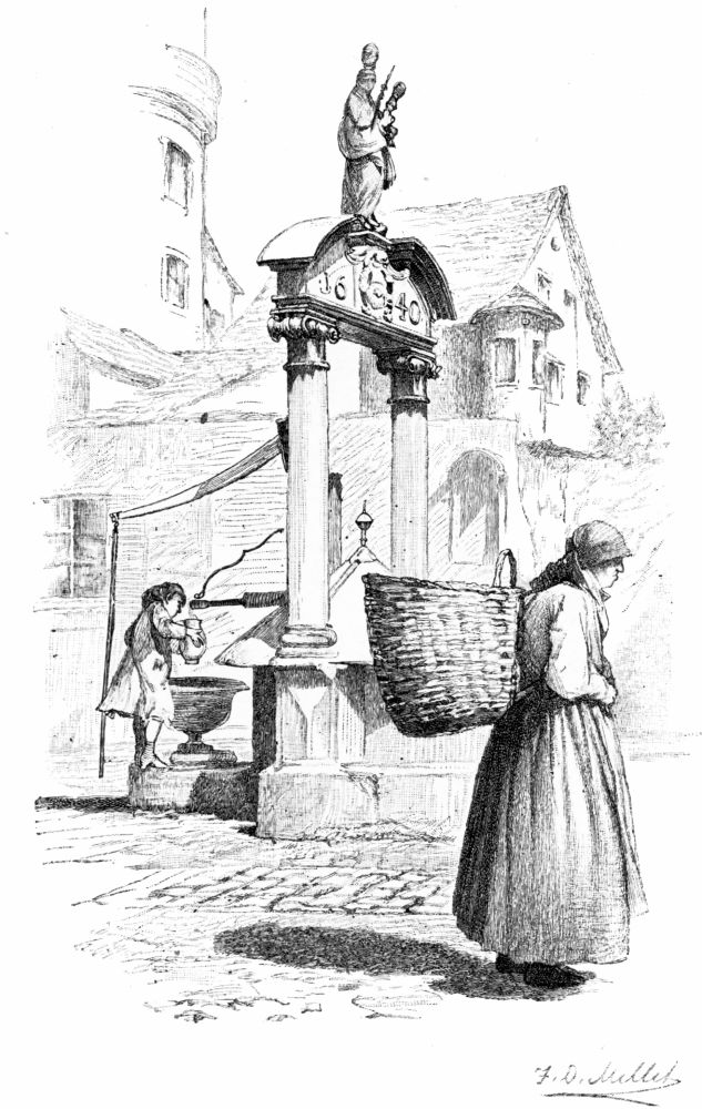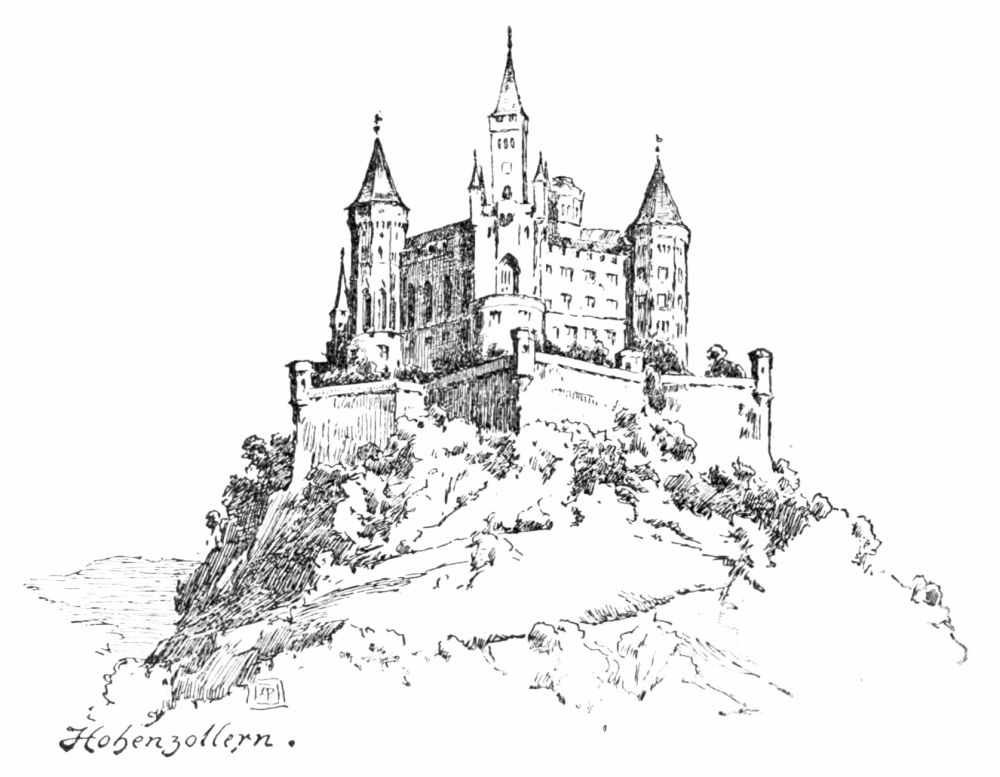 The quaintest and strangest of costumes met our eyes as we leaned out of the window of our compartment when the train stopped at the station of St. Georgen, eager to see how the brook had widened there. The hurrying peasant women, in queer skull-caps with immense ribbon bows, stiff bodices, and short petticoats, seemed to be the supernumeraries in the prologue of an exciting, drama now about to begin. The train rolled slowly on with that peculiar settling-down motion that denotes a descending grade, and we watched the yard-wide brook gradually expand its channel and assume the proportions of a goodly stream. In the fertile valley near Villingen, where the country opens out{5}