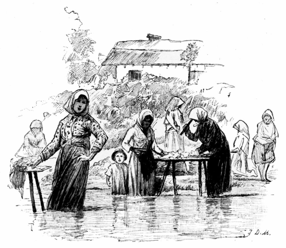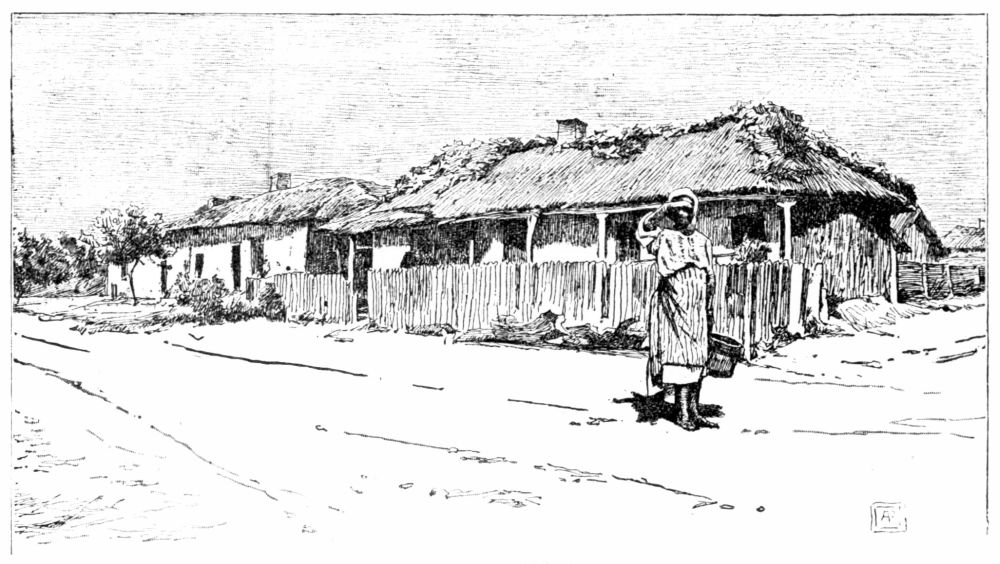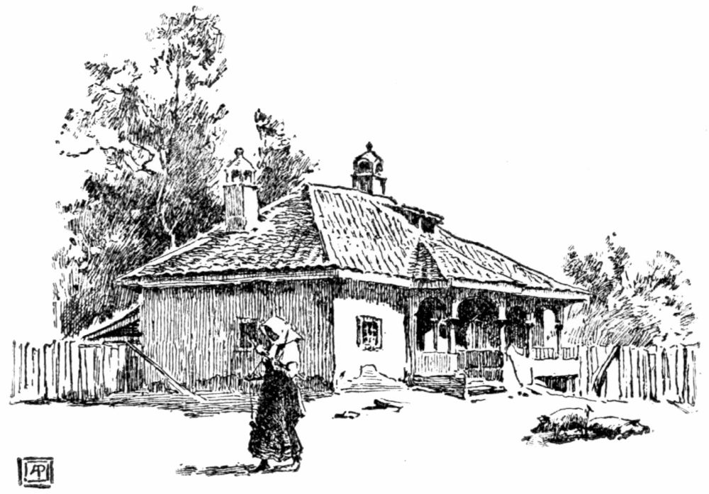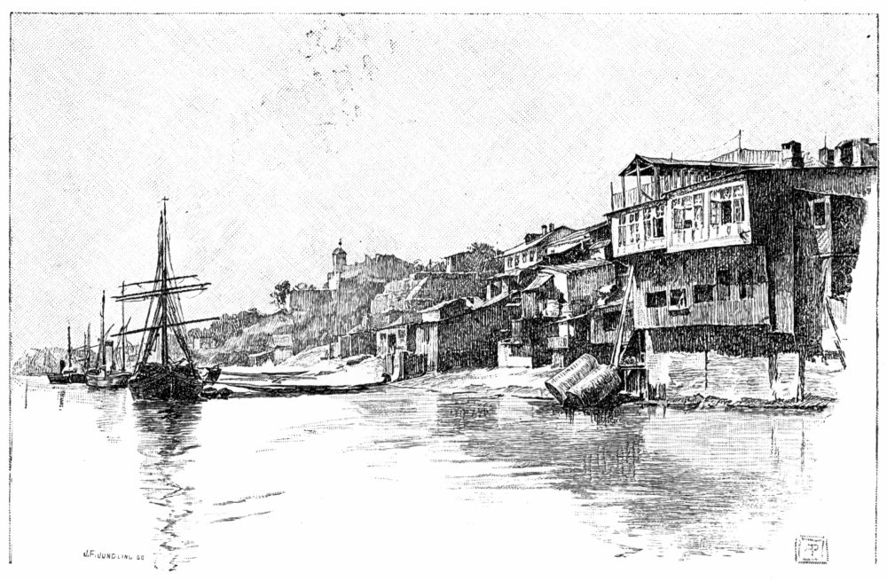The houses are low and solidly built, and most of them have one peculiar feature—a row of columns in front, supporting a projection of the roof. They stand closely together along straight thoroughfares which are little better than canals of mud, being only a few inches above the level of the river. The foundations of the houses are raised a foot or two above these sloughs, and roughly-hewn plank sidewalks, supported by piles, extend everywhere in front of the buildings, even into the narrow side alleys where fishermen’s huts are huddled together in the marsh among reeds and willows. Two great white churches, enclosed by neat palings, occupy the middle of wide, neglected squares, and look bleak and bare and uninviting. The house we visited was of one story, but long and deep, and was comfortably, even luxuriously, furnished. The drawing-room, where we took unlimited tea and sweets, after the Russian custom, might have been in Vienna or Bucharest, with its parquet floor and ornate furniture.