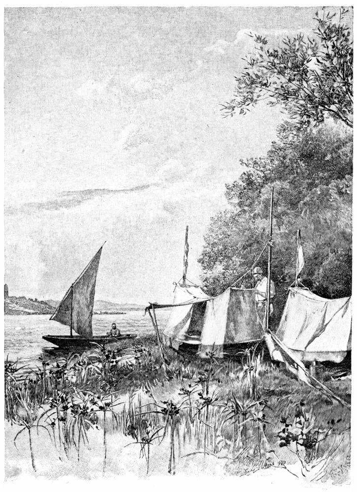 After a short paddle down a pleasant reach under perpendicular bluffs on the Russian shore, past frequent irrigating machines ingeniously constructed to lift the water upon the high plateau, we came out into a perfectly flat country partly wooded on either side. The strong north-east wind which had been blowing almost continuously for days gave us no rest, and raised a choppy sea which seriously checked our speed. About ten miles below Ismail the river divides into three parts, which join into one stream at Kilia fifteen miles farther on. We planned to camp somewhere above the latter town, and chose the central passage as probably the most direct one. For the rest of the afternoon we worked steadily, expecting to come in sight of Kilia long{306} before sunset. A swampy wilderness surrounded us, and not a yard of solid earth did we see. The frontier runs along the northerly limit of the delta on the banks of the smallest of the three lesser arms just described, and we therefore did not even have the company of the picket stations. Indeed, the only human habitations we came across were at a fishing-camp, where several rude huts were scattered about among the reeds and willows, their mud-floors scarcely a foot above the level of the water. It began to rain, and heavy storm-clouds, driven by the rising gale, swept over the whole sky. The sun went down and we had left the region of willows, and now saw nothing but reeds on all sides of us. Soon the gathering twilight drove us to seek a camp, although the domes of Kilia were not yet in sight. The only place we could find after a long search was a small clearing among the reeds on the left bank, where some fisherman had dried the stalks for floats to his nets. Here we hauled up the canoes, settled them firmly in the soft mud of the marsh, bow to bow, at an angle with each other, and, spreading a thick layer of freshly-cut reeds over the triangular space between the canoes and the edge of the bank, put up our tents and built a fire. The latter operation was not so easy as it sounds, for all the wood we could find was the water-soaked branches of willow which we broke from the snags or pulled out of the ooze of the banks. We were, however, prepared for just such an emergency and, lighting an ordinary little wire-gauze spirit-lamp, arranged the smallest twigs over the frame so they soon dried, then caught fire, and by their heat dried others, until we shortly had enough strength of flame to kindle the large pieces of sodden wood. Sheltered from the rain by our sketching umbrellas in the lee of the canoe tents, we cooked an elaborate dinner of several courses, and enjoyed as comfortable a meal as if our camp had been made on{307} the sound turf of an English meadow. As for our snug beds, they were quite as dry and warm as at any other bivouac, notwithstanding the fact that the canoes were lying in a slough of black mire.
