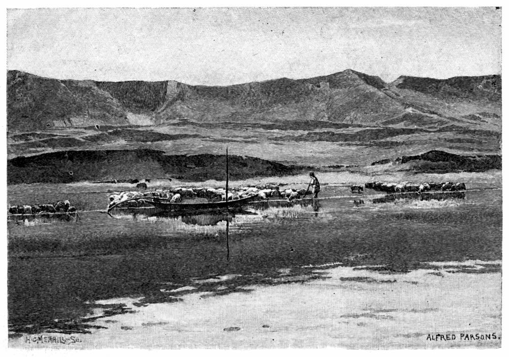 The following morning we were on our feet at dawn, eager to see what sort of country we had reached in the darkness. We found that we were at the “cordon,” or one of the Roumanian customs picket posts, on a point of land called Cape Masoura, and that we had come out into the Black Sea through that branch of the river called the Zaliv. The bay we had crossed in the twilight was an ancient mouth of the river, not navigable within the memory of man. Our camp was on the edge of a broad, rough meadow,{326} bordered on the north by great shallows where the sea is eating into the land, and extending for miles to the southward, where a range of sand-dunes hides Sulina from view, and to the west towards dark masses of the great forest on a low, sandy elevation which marks the line of the ancient sea-coast. The whole tract as far as we could see was gay with wild-flowers. In Alfred Parsons’ note-book are enumerated among the plants found on this sandy flat, sea-lavender (Stalice latifolia), small Michaelmas daisy, just coming into blossom, large-leaved meconopsis, mauve lactuca, and several yellow composite flowers. In the lakes of the delta among the reeds he found water-lilies, villarsia, frogbit, a floating plant like a yucca, with thorny edges to the leaves, a sort of duck-weed with rough primate leaves, and on the river-banks, loosestrife, hemp, agrimony, flowering rush, and a thick undergrowth of marsh fern.