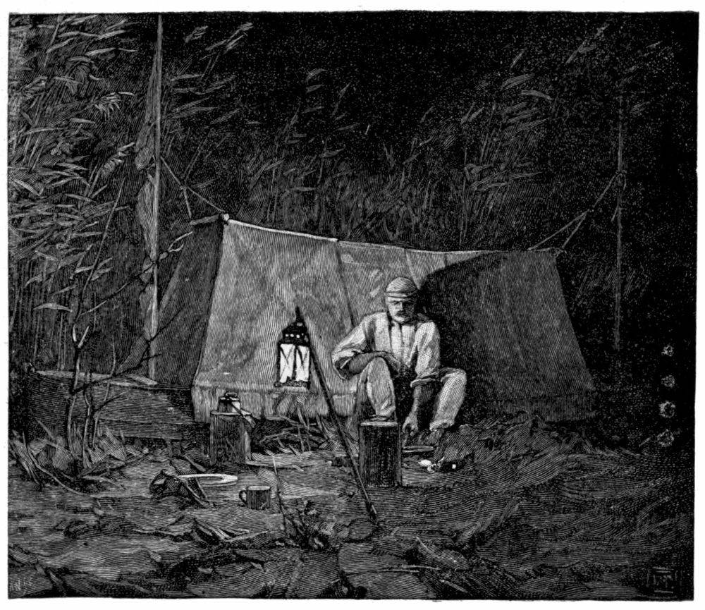 forgot when we reached camp, for there we were generally quite free and undisturbed and, moreover, exceedingly comfortable. We travelled from the very start on the principle that we could see more and work better if we treated ourselves well, and we therefore scorned neither comforts nor luxuries, made every reasonable effort to have regular meals and a varied bill of fare, and never, under any circumstances, neglected to keep our outfit clean and in good order. This may sound as if our out-of-door life was not what is usually called “roughing it,” and it certainly was not, if we accept the common definition of the term as qualifying the experiences of the raw recruit, the apprentice sailor, and the amateur camper. We found the maxim of the best men in the hunting field: “When the hounds are not running, never take a fence unless you are obliged to,” applied equally well to our excursion, and we therefore never roughed it unless we were compelled to do so by circumstances. In the whole extent of our trip, among all the novel scenes and the unique and interesting experiences, every incident of our camp life remains perfectly fresh in our memory.