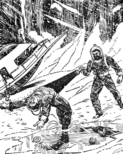Tom Headley watched his partner silently for a moment, then shrugged and checked the oxy-cylinder pressure-gauge. The needle pressed tight against its rest-pin. He lifted the glassite helmet, swung it idly in his hand for a moment. He knew the grimness of the moment, knew that the tank on his back held less than six hours of life-saving oxygen. When that was gone, if he were not back at the ship, he would die. A wry smile lifted the corners of his mobile mouth. Within the suit were enough concentrates and vitamin capsules to last him for months, and a special apparatus made it possible for water to be drawn from the air he breathed. He grinned at the thought; without air, the rest was superfluous.