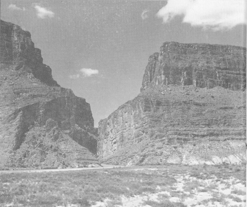 Here, a deep gash in the mesa de Anguila and Sierra Ponce marks the course of the river for eighteen miles. Through millions of years, the silt and gravel laden waters have continued their endless task of grinding away the limestone bit by bit until now the walls of the canyon rise perpendicularly more than fifteen hundred feet above the waters of the river.