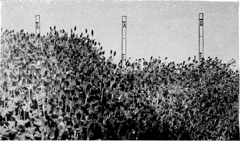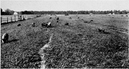 Crimson clover grows rapidly in fall and spring and furnishes an abundance of grazing (fig. 3). If planted early and good fall growth is made, the clover may also be grazed during the fall and winter months. Such a practice has been successfully followed in many States where crimson clover is providing winter pasture. Crimson clover combined with small grains or ryegrass has been most widely used for winter grazing. Crimson clover makes little growth during cold periods in winter. Under such conditions, to prevent close grazing, it is necessary to remove the animals or shift them to other fields that have not been grazed.