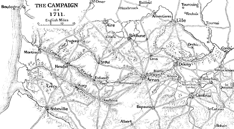 France, on the other hand, possessed the finest and strongest army in Europe,—well equipped, well trained, well organised, and inured to work by countless campaigns. She had a single man in supreme control of affairs, King Lewis the Fourteenth; a great war-minister, Louvois; one really great general, Luxemburg; and one with flashes of genius, Boufflers. [Pg 8] Moreover, she possessed a line of posts in Spanish Flanders extending from Dunkirk to the Meuse. On the Lys she had Aire and Menin; on the Scarpe, Douay; on the Upper Scheldt, Cambray, Bouchain, Valenciennes, and Condé; on the Sambre, Maubeuge; between Sambre and Meuse, Philippeville and Marienburg; and on the Meuse, Dinant. Further, in the one space where the frontier was not covered by a friendly river, between the sea and the Scheldt, the French had constructed fortified lines from the sea to Menin and from thence to the Scheldt at Espierre. Thus with their frontier covered, with a place of arms on every river, with secrecy and with unity of purpose, the French enjoyed the approximate certainty of being able to take the field in every campaign before the Allies could be collected to oppose them.