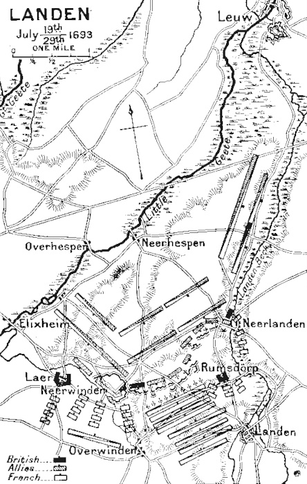 Glancing at it on the map, the reader will see that this quadrilateral is cut by a number of rivers running parallel to each other from south to north, and flowing into the main streams of the Demer and the Scheldt. The first of these, beginning from the east, are the Great and Little Geete, which become one before they join the main stream. It is worth while to pause for a moment over this little slip of land between the Geete and the Meuse. We shall see much of Namur, Huy, Liège, and Maestricht, which command the navigation of the greater river, but we shall see still more of the Geete, and of two smaller streams, the Jaar and the Mehaigne, which rise almost in the same table-land with it. On the Lower Jaar, close to Maestricht, stands the village of Lauffeld, which shall be better known to us fifty years hence. On the Little Geete, just above its junction with its greater namesake, are the villages of Neerwinden and Landen. In the small space between the heads of the Geete and the Mehaigne lies the village of Ramillies. For this network of streams is the protection against an enemy that would threaten the navigation of the Meuse from the north and west, and the barrier of Spanish Flanders against invasion from the east; and the ground is rich with the corpses and fat with the blood of men.