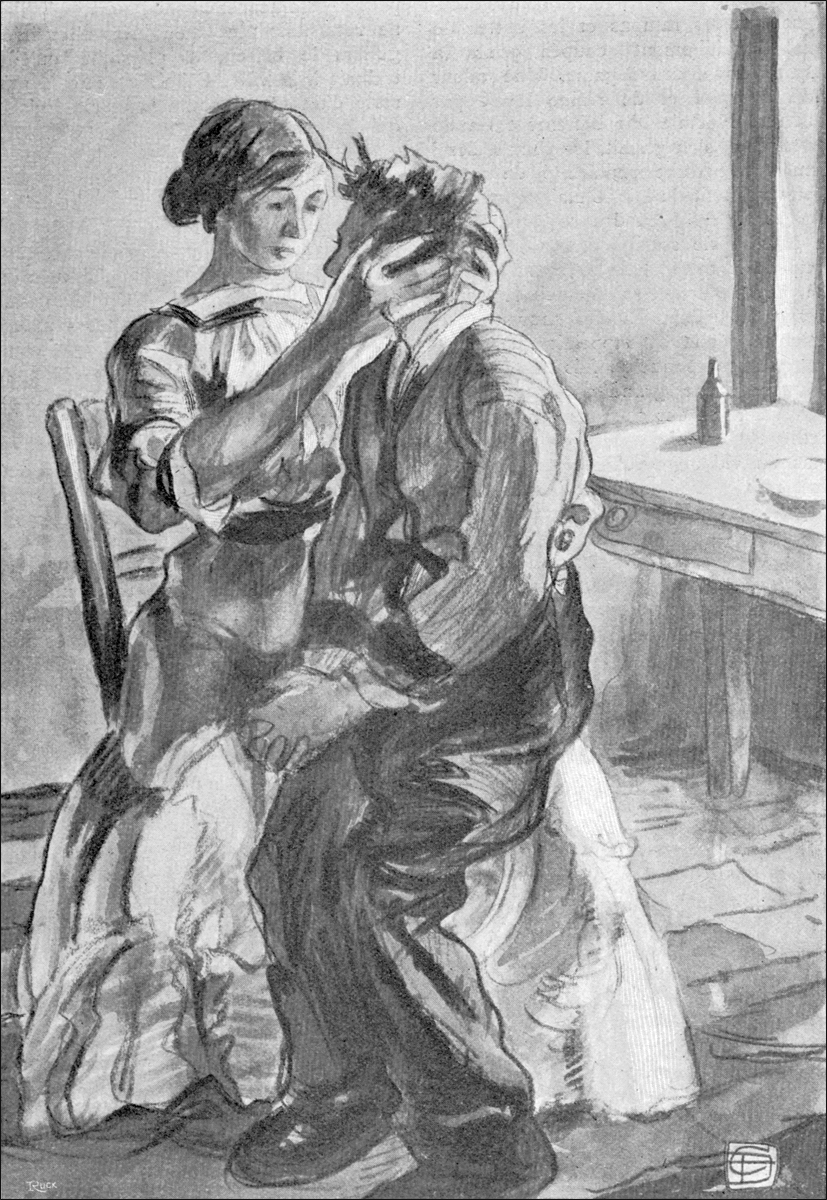 Moederke, de saisissement, laissa tomber sa banne avec les pommes de terre qui étaient dedans et qui se mirent à rouler sous la huche, la table et le bahut. Alain, lui, avec une main à sa gorge comme pour arracher les mots qui ne venaient pas, disait enfin humblement: