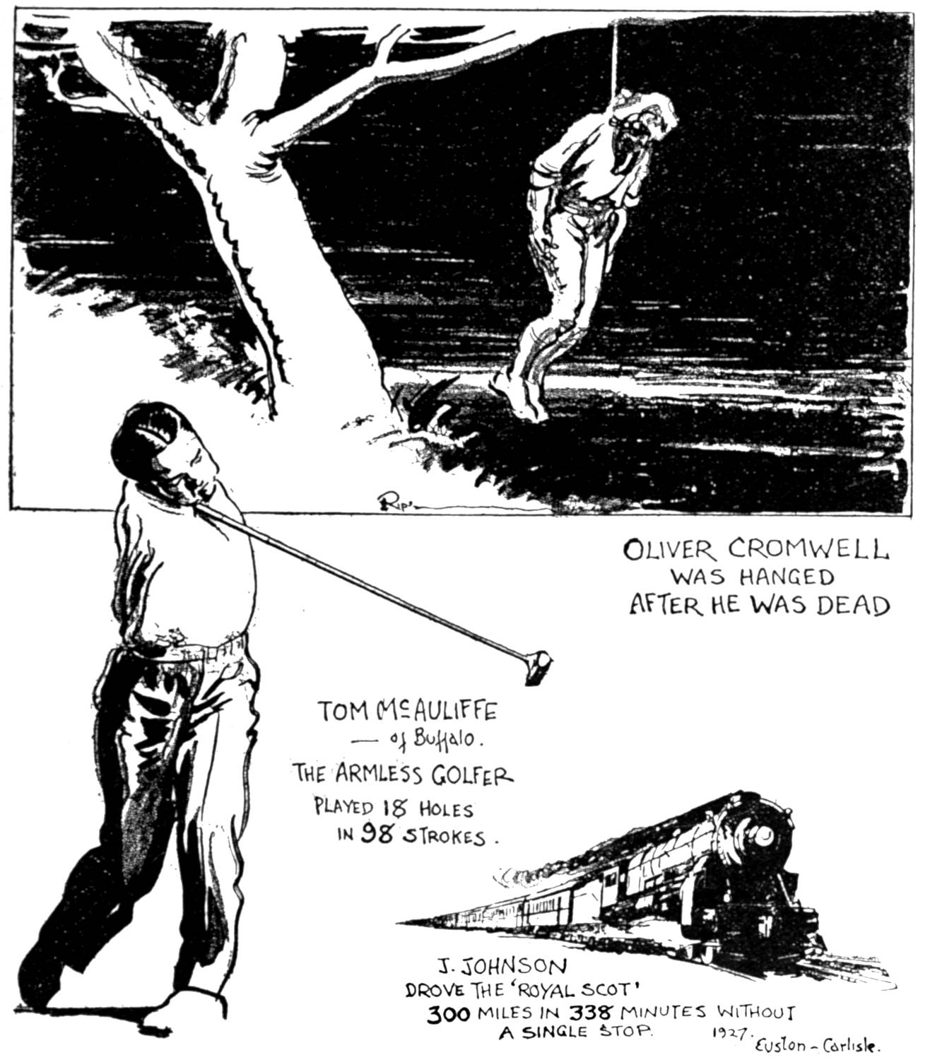 I shall not forget the day my cartoon appeared with the illustrated statement that “Lindbergh was the sixty-seventh man to make a non-stop flight over the Atlantic Ocean.” Who would believe a statement like that? Three thousand wrote in to tell me that they did not. It is true, however. Who will believe that “a day is forty-eight hours long—not twenty-four”; “that Methuselah died before his father”; that “Buffalo Bill never shot a buffalo in his life”; that “a man died of old age before he was seven years old.” Can anybody be expected to believe that “a river runs backward”; “a flower eats mice”; “Napoleon crossed the Red Sea—as Moses did—on dry land”; “Fish climb trees,” etc.?